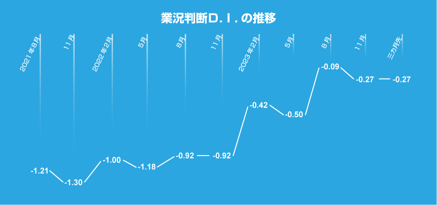 また、三ヶ月先の「業況判断DI」も-0.27となり、足元同様、悪化する結果となった。