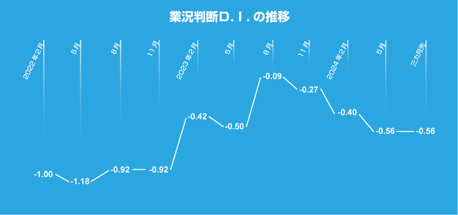 また、三ヶ月先の「業況判断DI」も-0.56となり、一段の円安による影響を懸念する声が多い。