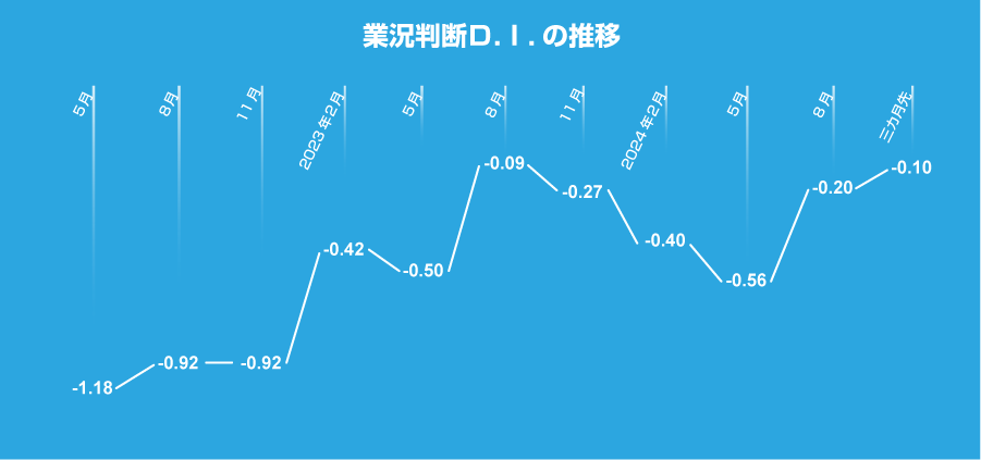 今回調査の業況判断は -0.20との結果。前回11月調査(-0.56)から改善。昨年8月ぶりの前月比プラスとなった。概況については引き続き外出、イベント需要は好調で、特にインバウンドが円安効果で大幅に伸長しており、全体の景況自体はコロナ禍前の水準に戻っているものの、物価高を背景とした節約志向による日常の買い控え傾向は続いていて余談は許さないが、アメリカの利下げと日本の利上げ方針が重なった結果、大幅な円高に振れており、仕入れコストの上昇リスク減少の期待感があるのではないかと思われる。