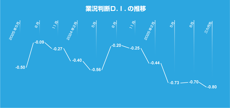 今回調査の業況判断は -0.70との結果。前回2月調査(-0.73)からほぼ横ばい。コメを中心とした食料品価格の高止まり、物価上昇が継続し、節約志向が継続している。インバウンド需要も円高に振れたことでブレーキがかかっており、非常に厳しい結果となった。